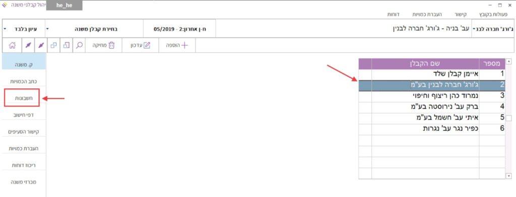 ברשימת קבלני המשנה, לסמן את הקבלן שעבורו רוצים להזין נתוני ביצוע, וללחוץ בצד שמאל על הכפתור “חשבונות”: