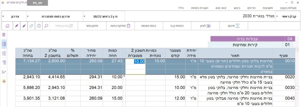 להגדיר את החשבון, ולהזין בו נתוני ביצוע בסעיפים שבהם ביצע הקבלן עבודות:
