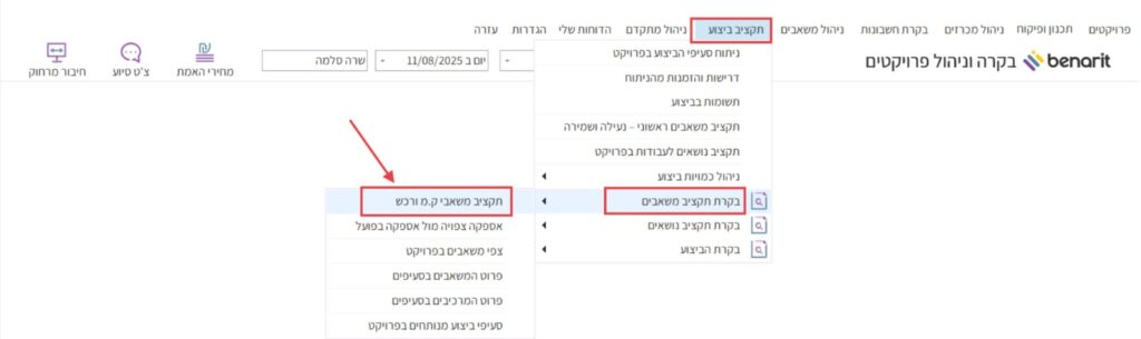 כדי להפיק את הדוח יש לגשת מהמסך הראשי ל”תקציב ביצוע” > “בקרת תקציב משאבים” > “תקציב משאבי ק.מ ורכש”: