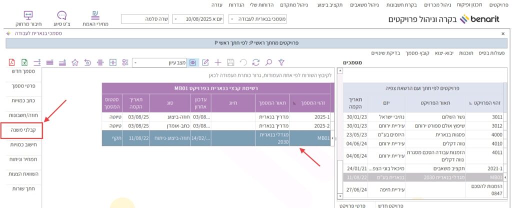 במסך “קבצי בנארית לעבודה” לעמוד על הקובץ שבו מוגדר החוזה הראשי, וללחוץ בצד שמאל על “קבלני משנה”: