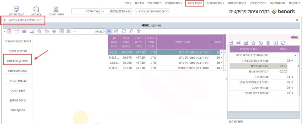במסך הראשי להיכנס לתוכנת “תקציב ביצוע” > “ניתוח סעיפי הביצוע בפרויקט”. ללחוץ בצד שמאל על הכפתור “סעיפי ק.מ. בניתוח”: