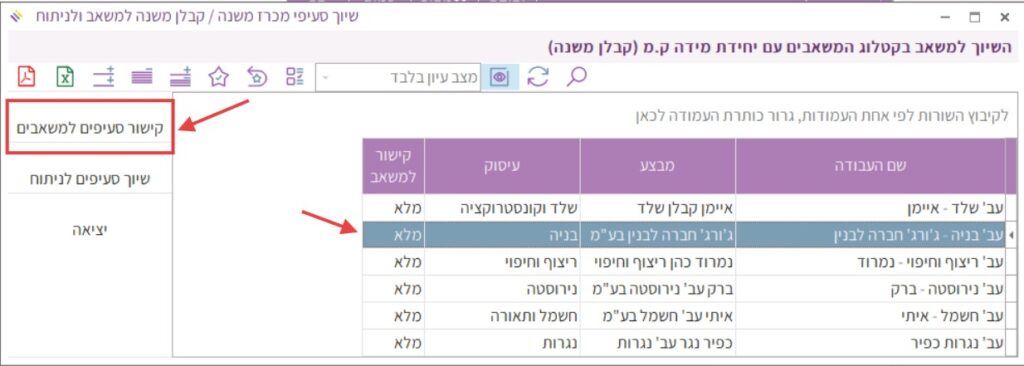 לסמן את קבלן המשנה שאת סעיפיו רוצים לשייך למשאב ק.מ., וללחוץ בצד שמאל על הכפתור “קישור סעיפים למשאבים”: