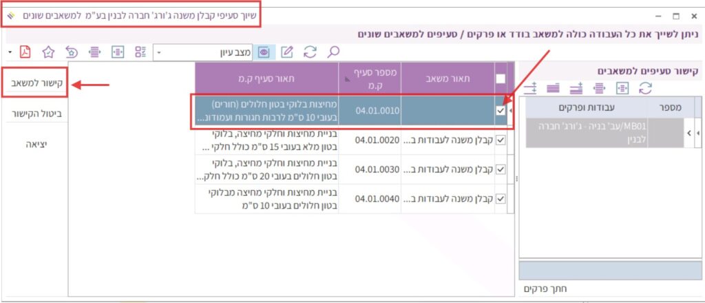 לסמן את הסעיפים של קבלן המשנה שאותם רוצים לשייך למשאב ק.מ., וללחוץ בצד שמאל על הכפתור “קישור למשאב”: