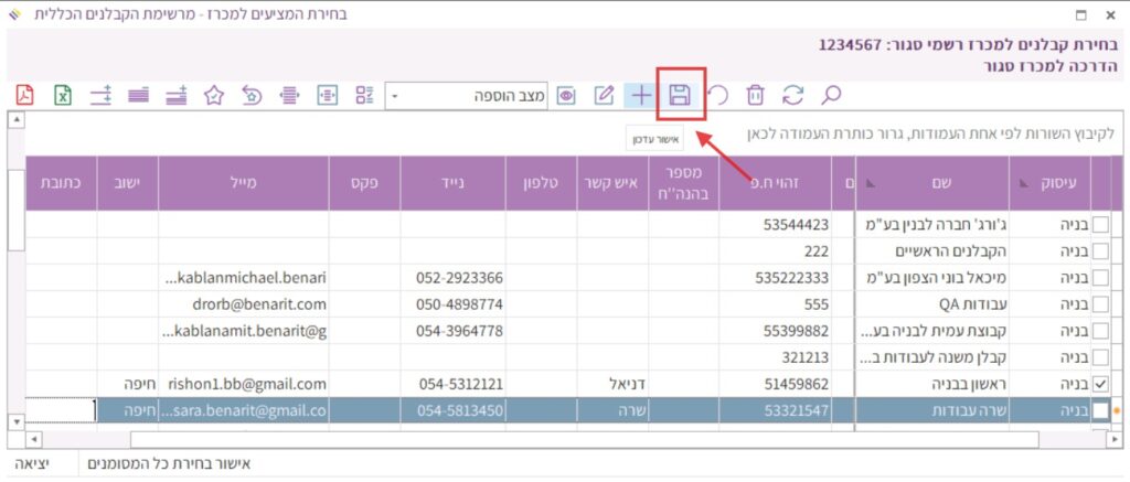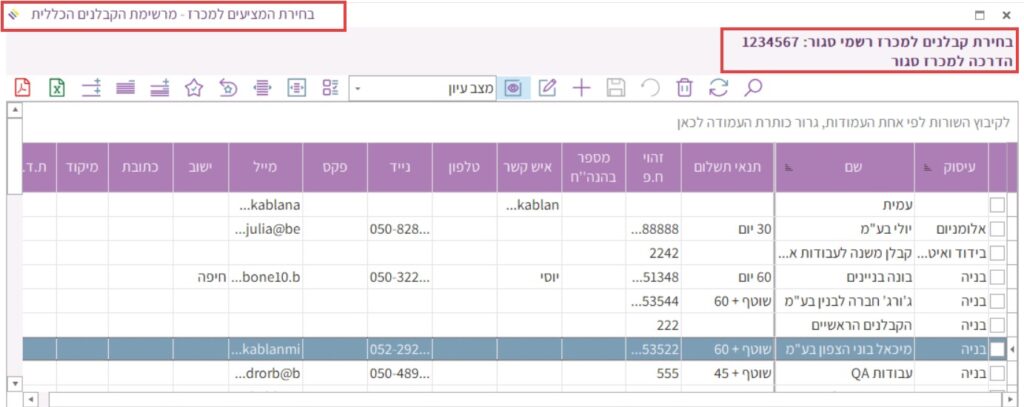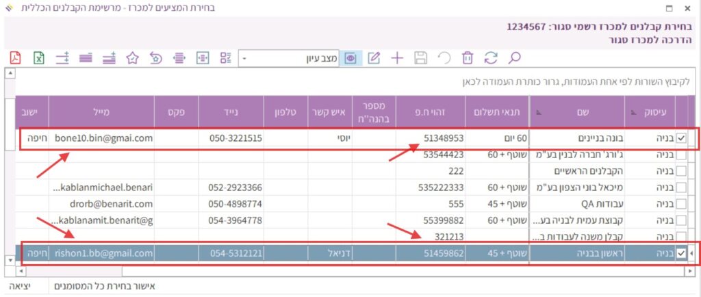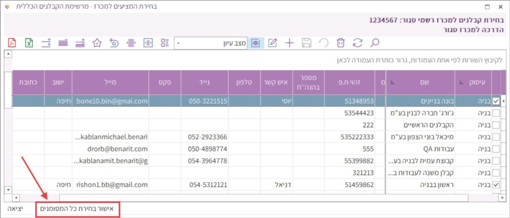 2. בחלונית “בחירת קבלנים” יש לסמן ב-V את הקבלנים שרוצים שישתתפו במכרז. יש לוודא שכתובת המייל ומספר הח.פ של הקבלן שבוחרים הם נכונים: