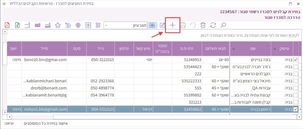 3. אם הקבלן שרוצים שישתתף במכרז לא מופיע ברשימת הקבלנים, יש להוסיפו לרשימה ולמלא את פרטיו. כדי להוסיף קבלן לרשימה יש ללחוץ למעלה בסרגל הכלים על הכפתור “הוספה”: