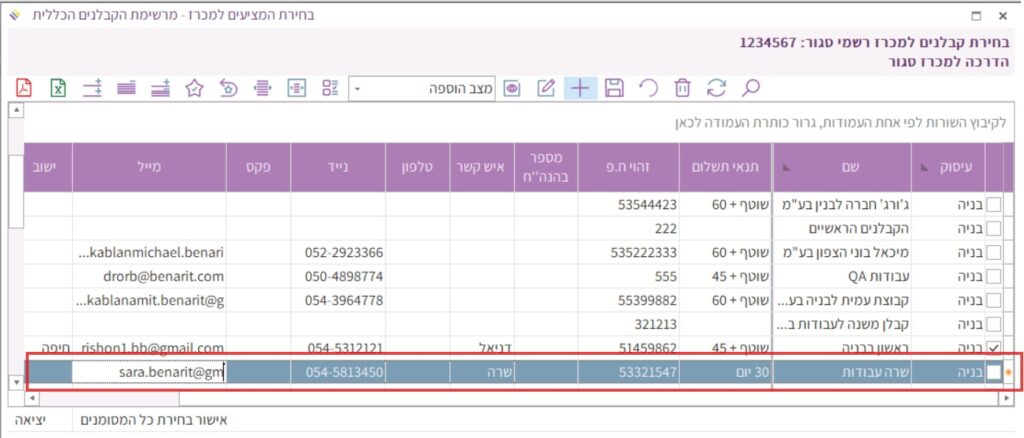 נפתחת שורה חדשה. יש להזין בשורה החדשה את פרטי הקבלן – עיסוק, שם, ח.פ., נייד וכתובת מייל: