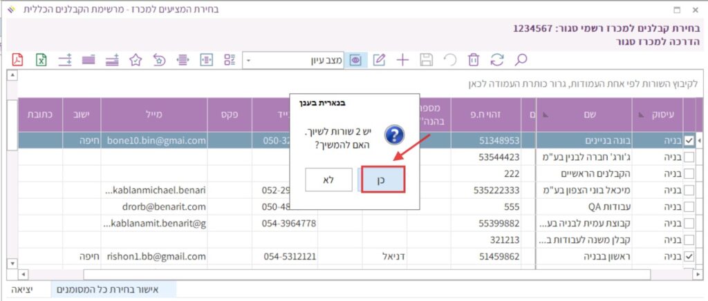 5. תופיע הודעה על מספר הקבלנים שאנו משייכים למכרז. להשלמת הפעולה ללחוץ על “כן”: