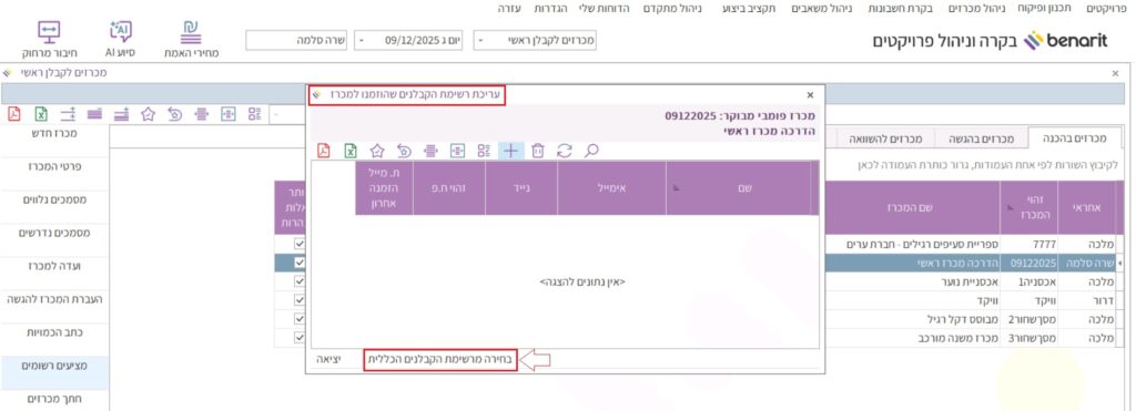 3. נפתחת החלונית “בחירת המציעים למכרז – מרשימת הקבלנים הכללית”: