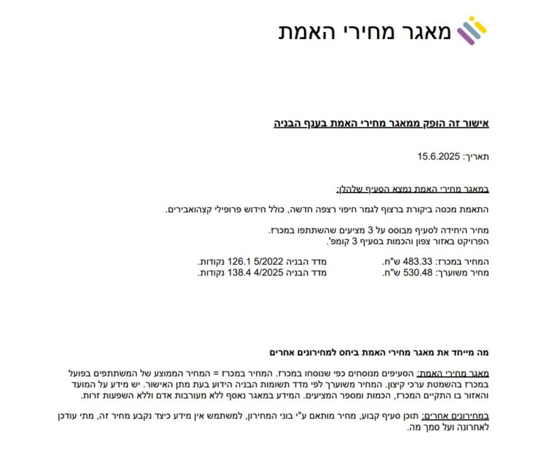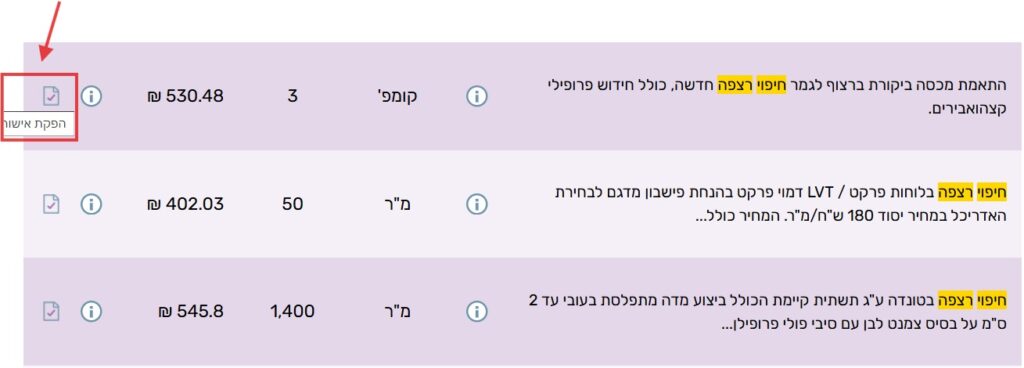 5. לחיצה על “הפקת אישור” בצדו השמאלי של הסעיף מאפשרת הדפסת אישור למקור התמחור של הסעיף.