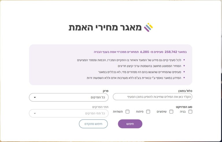 2. נפתח המסך הראשי של מאגר מחירי האמת של בנארית, המציג מידע על המאגר ומאפשר למשתמש לאתר את  סעיפים הדרושים לו.