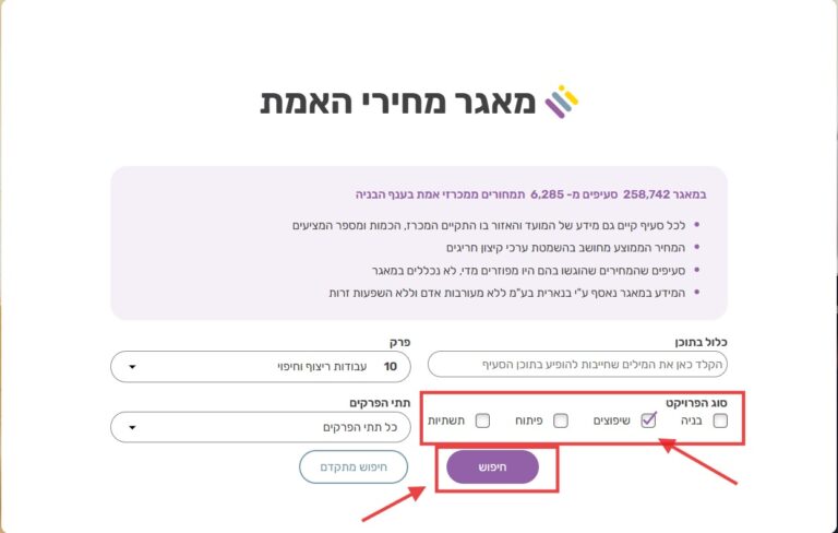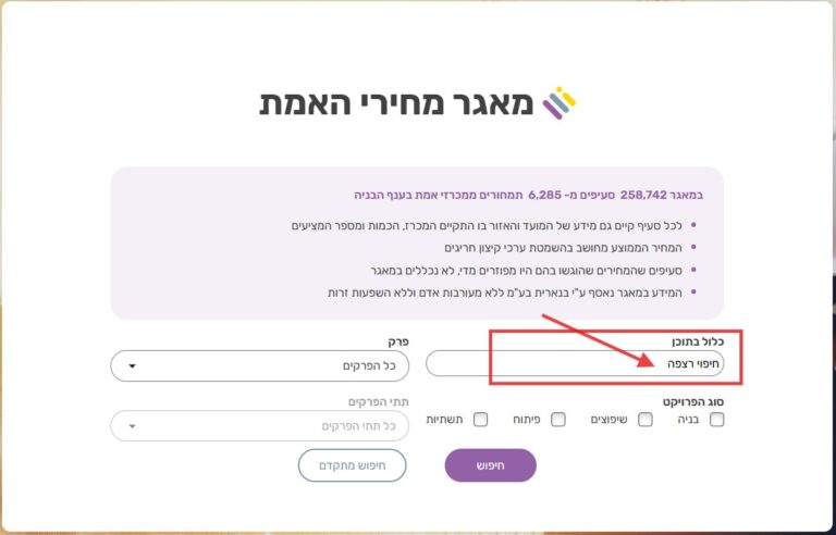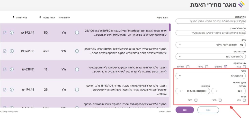 3.1 בשדה “עבור” ניתן לבחור את מטרת הפרויקט, ובכך להגביל את תוצאת החיפוש רק לסעיפים שרלוונטיים לסוג מסוים של פרויקט. למשל, ניתן לחפש רק סעיפים מפרויקט שמטרתו “מבנה ציבור“.