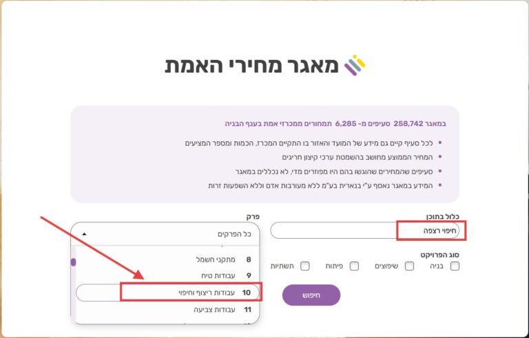 למשל, ניתן לבחור מהרשימה את פרק “עבודות ריצוף וחיפוי” כדי להגביל את החיפוש רק לסעיפים שקשורים לפרק.