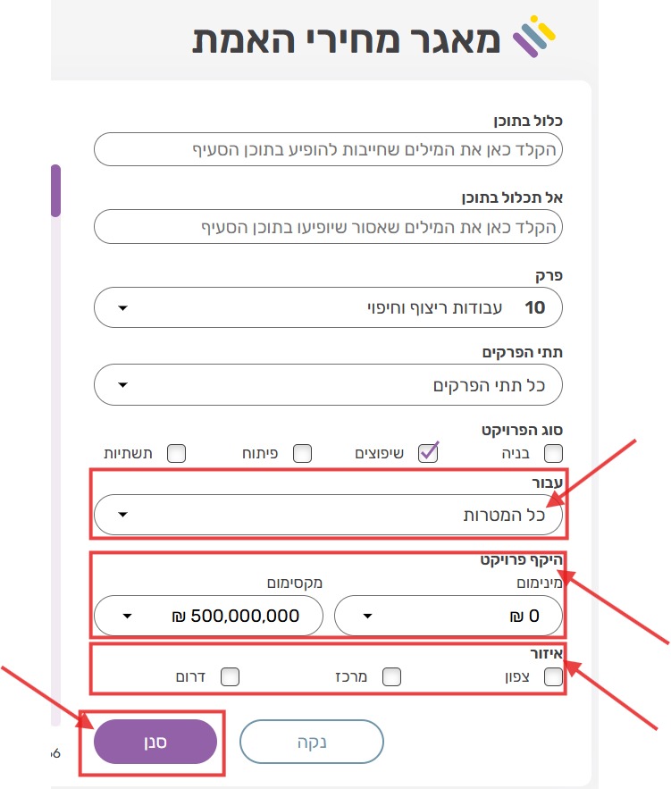 לאחר הגדרת הפרמטרים לחיפוש, ללחוץ על “סנן“: