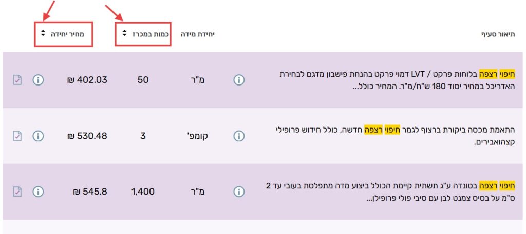 ניתן למיין את הסעיפים בסדר עולה או יורד לפי עמודת כמות במכרז או מחיר יחידה.