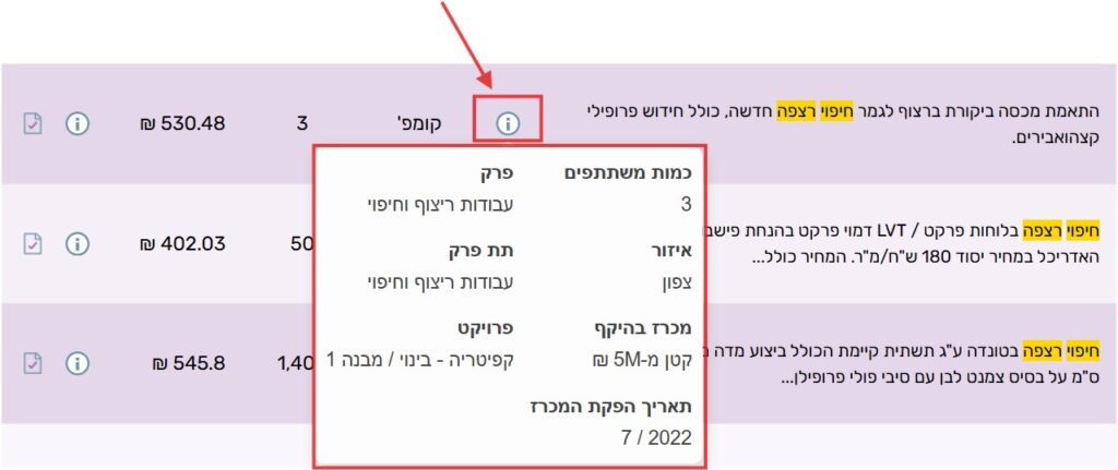 4.1 בעמידה על “סימן המידע” ליד כל סעיף ניתן לקבל מידע נוסף, כמו: כמות המשתתפים במכרז, אזור המכרז, היקף המכרז ומועדו.