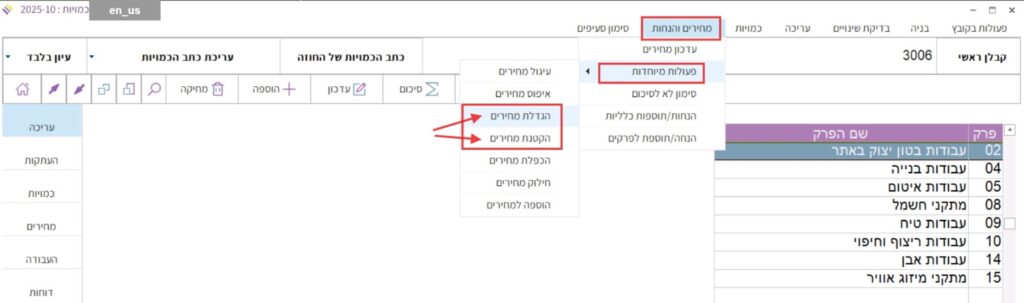 1. מתוך כתב הכמויות להיכנס למעלה לתפריט “מחירים והנחות” > להצביע על “פעולות מיוחדות” > ולבחור בפקודה “הגדלת מחירים” או “הקטנת מחירים”: