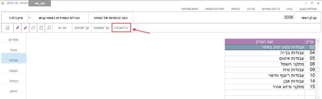 2. בסרגל שמעל טבלת כתב הכמויות, ללחוץ על הכפתור “כל העבודה”: