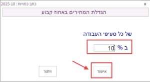 3. בחלונית שנפתחת מזינים את האחוז שבו רוצים להגדיל או להקטין את המחירים, ולוחצים על “אישור”: