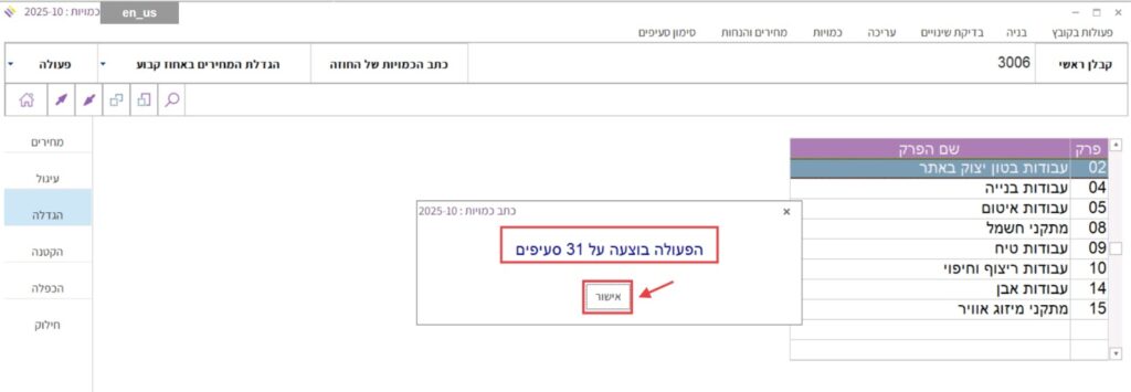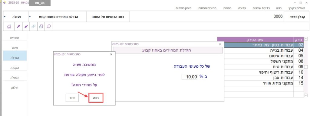 כדי להגדיל או להקטין את מחירי כתב הכמויות באחוז מסוים, יש לבצע את הפעולות הבאות: