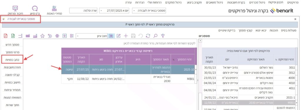 במסך הראשי, “מסמכי בנארית לעבודה” לסמן את המסמך שבו רוצים לבצע את השינוי וללחוץ בסרגל בצד שמאל על “כתב כמויות”: