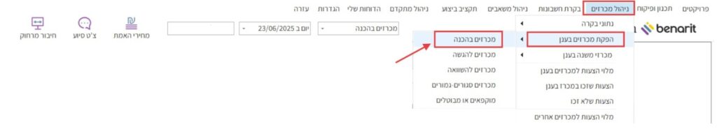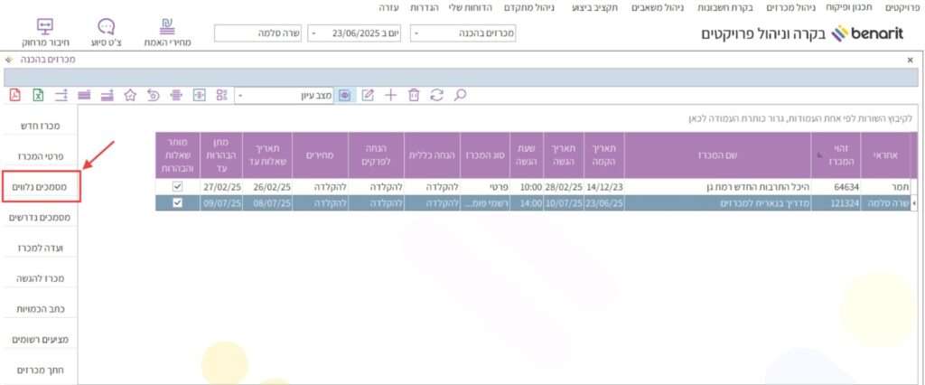 1. במסך הראשי של בנארית להיכנס לתפריט “ניהול מכרזים” > לבחור “הפקת מכרזים בענן” > ובתפריט המשנה לבחור “מכרזים בהכנה”: