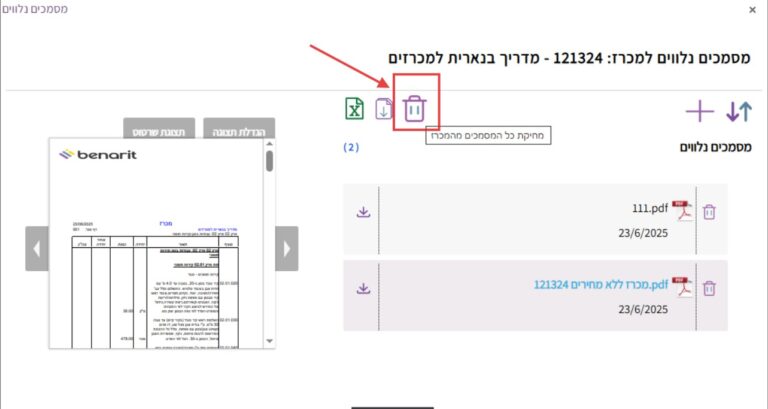 8. למחיקת כל המסמכים מהמכרז ללחוץ על סמל הפח שמעל: