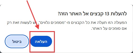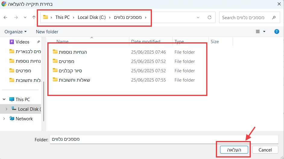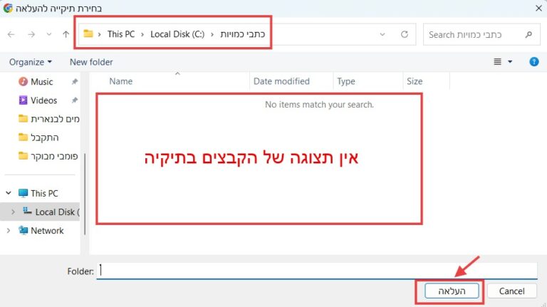 *שימו לב*: גם אם בתצוגת הקבצים התיקיה נראית ריקה, לוחצים על “העלאה”: