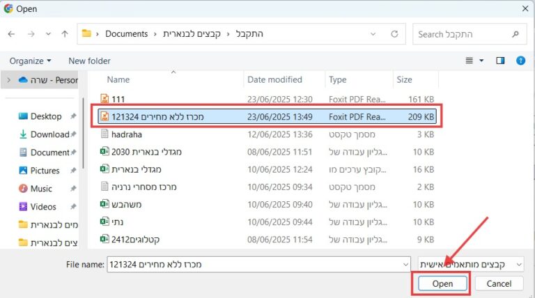 יש לאתר את התיקייה, לסמן את הקובץ שרוצים לצרף וללחוץ על הכפתור “Open”.