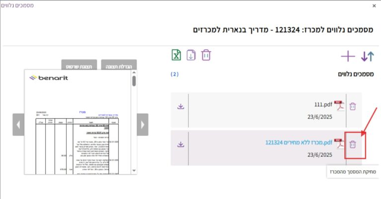 7. ניתן להסיר קובץ שהועלה על ידי לחיצה על סמל הפח שלצד שם הקובץ: