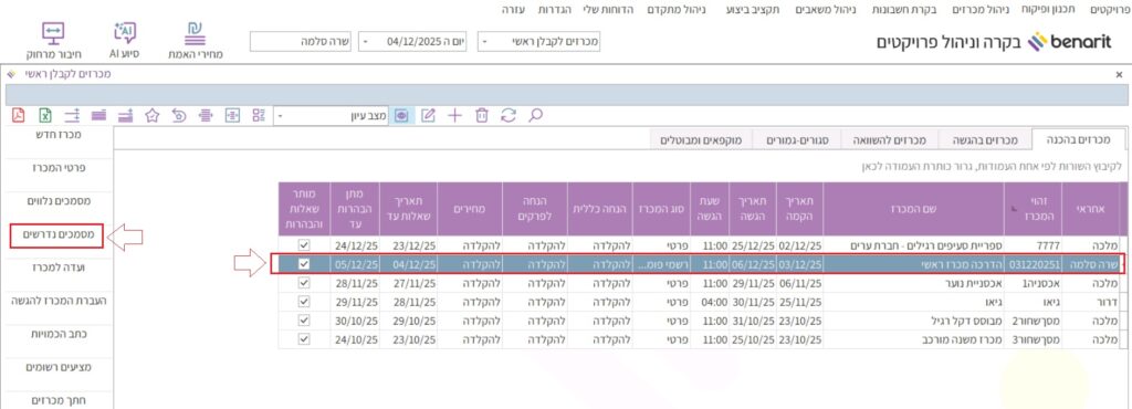 2. ברשימת המכרזים, לסמן את המכרז שלגביו רוצים להוסיף רשימת מסמכים נדרשים, ולאחר מכן ללחוץ בסרגל הכפתורים השמאלי על הכפתור “מסמכים נדרשים”: