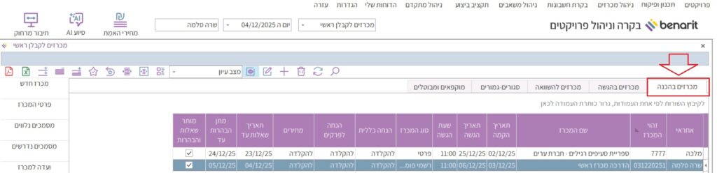מתקבל מסך “מכרזים לקבלן ראשי, והלשונית הפעילה היא “מכרזים בהכנה“: