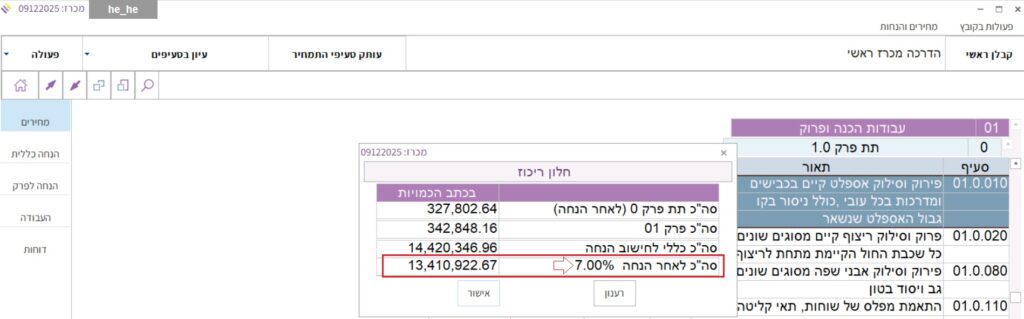 1.4 אם הוגדרו הנחה כללית או הנחות לפרקים הן יבואו לידי ביטוי בחלון הריכוז: