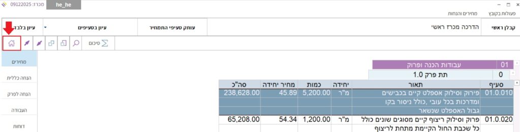 1.5 כדי לחזור מהמסך של כתב הכמויות אל מסך התמחיר, יש ללחוץ בסרגל האייקונים בצד שמאל למעלה על כפתור “הבית”: