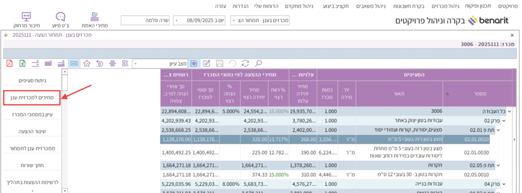 3. ללחוץ בסרגל הכפתורים השמאלי על הכפתור “מחירים למכרזית-ענן”: