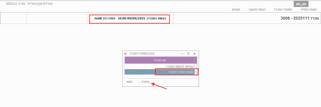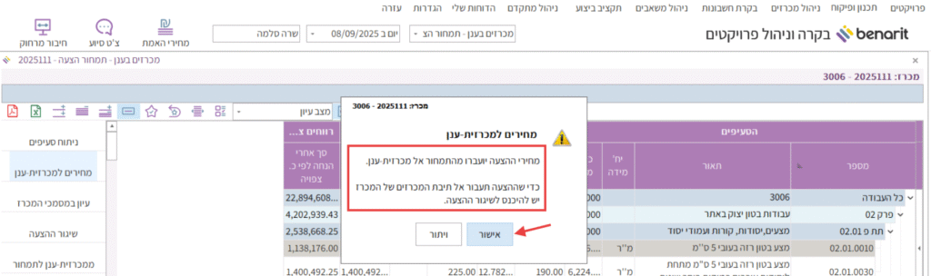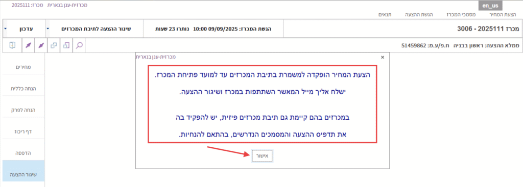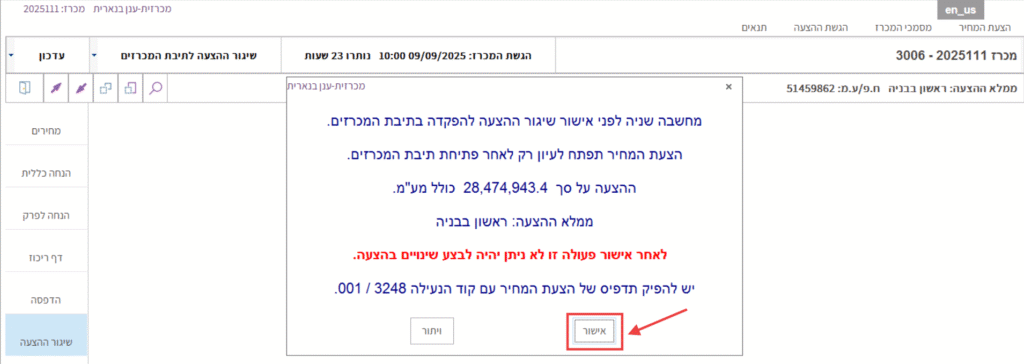 8. מופיעה התרעה על כך שלאחר אישור הפעולה לא ניתן יהיה לבצע שינויים בהצעה.