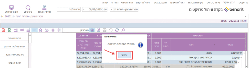 5. מתקבלת הודעה שהפעולה הסתיימה בהצלחה. ללחוץ על “אישור”: