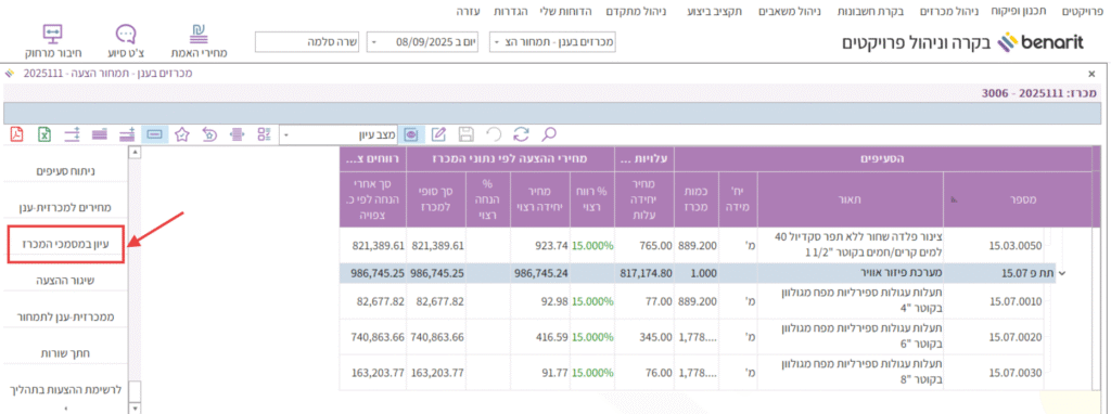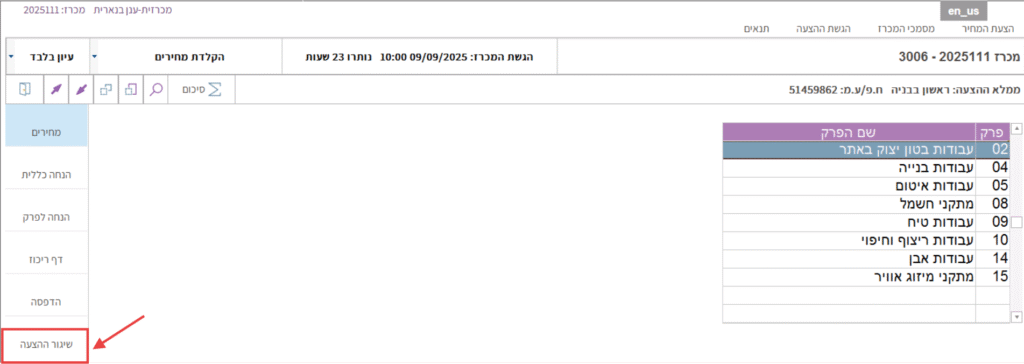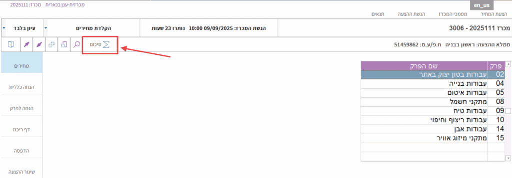 5. לאחר הכניסה אל המכרז בענן, ללחוץ בסרגל האייקונים בצד שמאל על הכפתור “סיכום” כדי לוודא שהסה”כ של ההצעה בתמחור זהה לסה”כ במכרז: