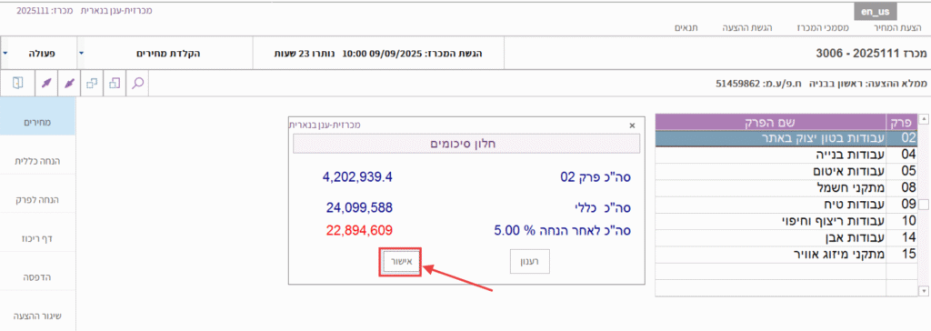 6. נפתח חלון סיכומים שמציג את הסה”כ של ההצעה.  ללחוץ על “אישור”: