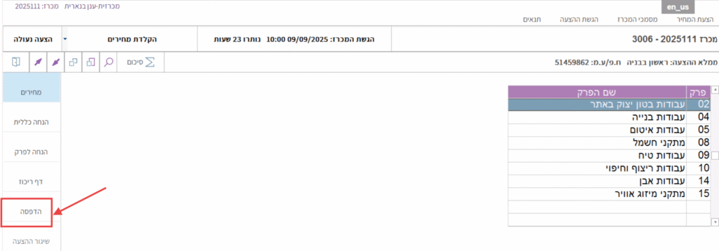 11. אם יש צורך להגיש תדפיס חתום של הצעת המחיר, ניתן להפיק תדפיס באמצעות הכפתור “הדפסה” בסרגל השמאלי: