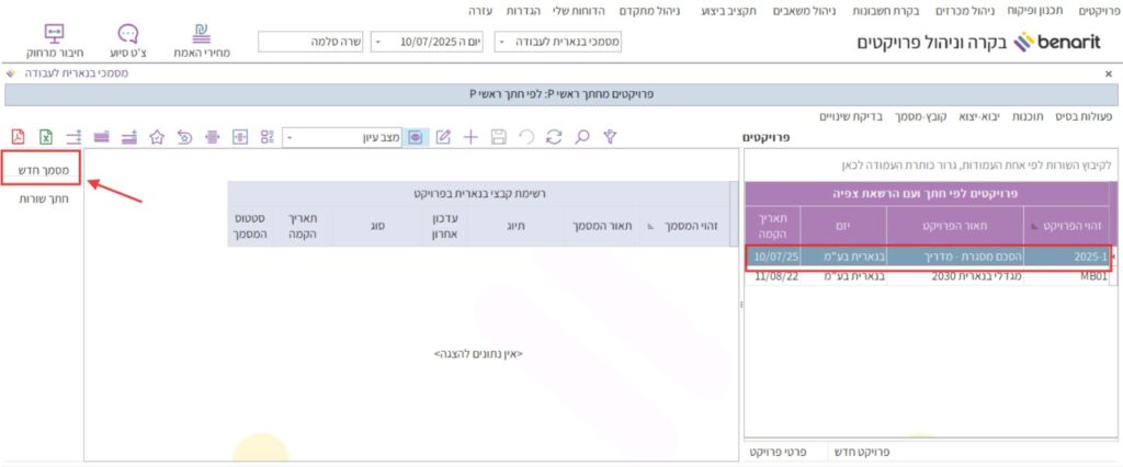 3. השורה של הפרויקט החדש מתווספת לרשימת הפרויקטים במסך “מסמכי בנארית לעבודה”.