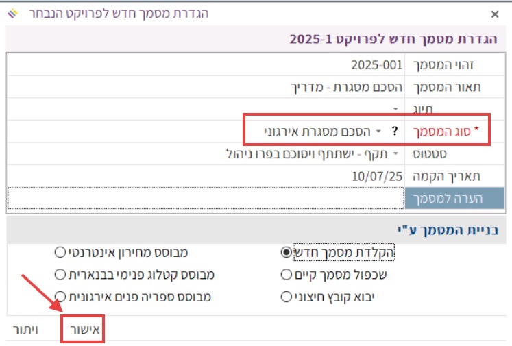 4. נפתחת החלונית “הגדרת מסמך חדש לפרויקט הנבחר”.