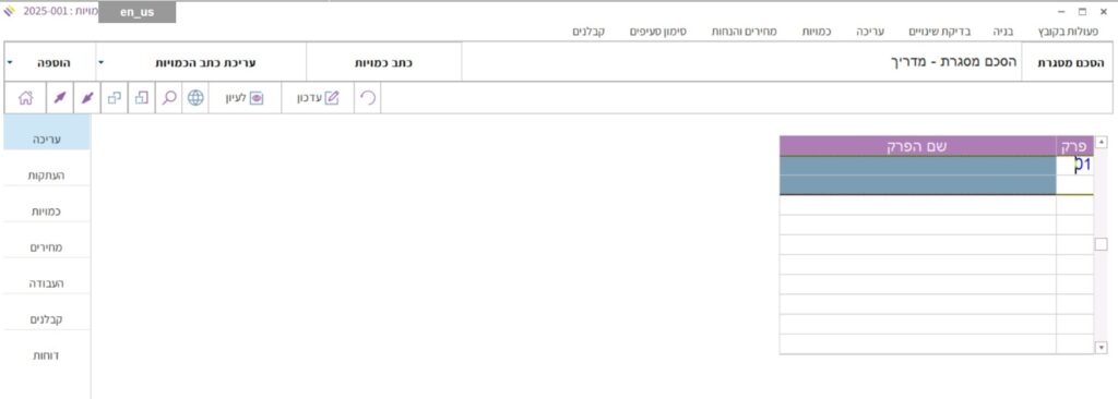 בשלב הקודם יצרנו קובץ חדש מסוג הסכם מסגרת והגענו למסך של כתב הכמויות הריק של הסכם המסגרת:
