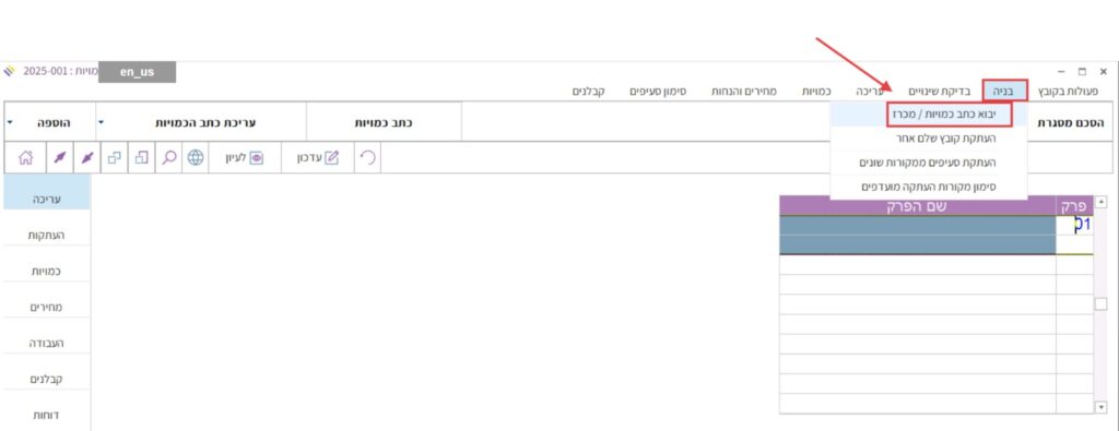 3.1 במסך של כתב הכמויות הריק להיכנס בצד ימין למעלה לתפריט “בניה” > ולבחור “יבוא כתב כמויות / מכרז”: