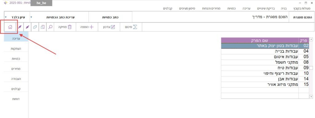 4. לאחר שהגדרנו בקובץ את סעיפי ההסכם, בין אם בהקלדה, בהעתקה מקובץ אחר או באמצעות יבוא, יש לחזור למסך הראשי באמצעות לחיצה על כפתור הבית בצד שמאל למעלה: