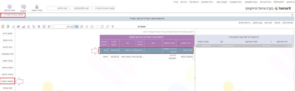 1. ממסך “מסמכי בנארית לעבודה” לסמן את המסמך שרוצים לעדכן ובסרגל השמאלי ללחוץ על “השוואת הצעות”: