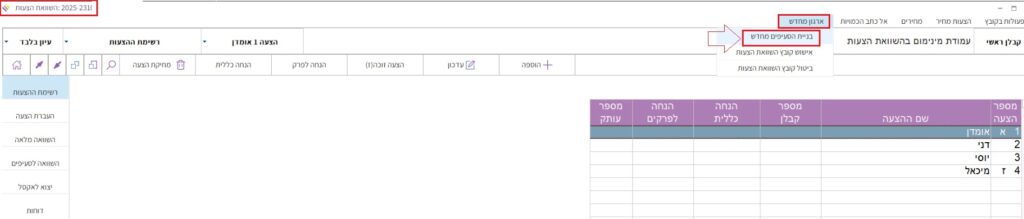 2. במסך “רשימת ההצעות”, משורת התפריטים העליונה לבחור בתפריט “ארגון מחדש”> וללחוץ על “בניית הסעיפים מחדש”: