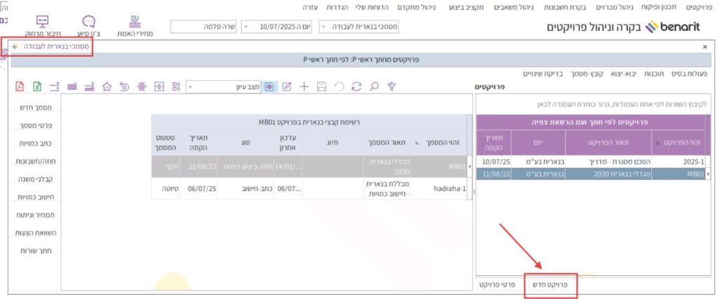 2. נפתח המסך “מסמכי בנארית לעבודה”. בצד ימין למטה ללחוץ על “פרויקט חדש”: