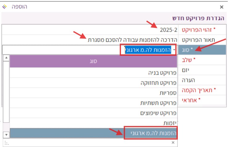 שימו לב: הכרחי לבחור בשדה סוג את האפשרות “הזמנות לה.מ ארגוני” כדי שניתן יהיה ליצור בפרויקט הזמנות עבודה מתוך הסכם מסגרת ארגוני. אם ייבחר סוג אחר מהרשימה, יווצר פרויקט רגיל שניתן להגדיר בו קבצים רגילים של כתבי כמויות ולא הזמנות עבודה.