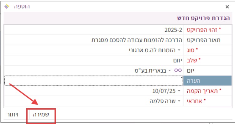 3.9 לאחר שמולאו כל השדות בחלונית “הגדרת פרויקט חדש” ללחוץ על “שמירה”: