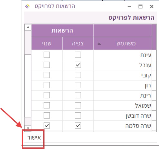 המשתמש שיצר את הפרויקט מקבל באופן אוטומטי הרשאות צפיה ושינוי בפרויקט, וכל משתמש מסוג מנהלן מקבל אוטומטית הרשאת צפיה. ניתן להוסיף הרשאות בהתאם לצורך. לסיום ללחוץ על “אישור”: